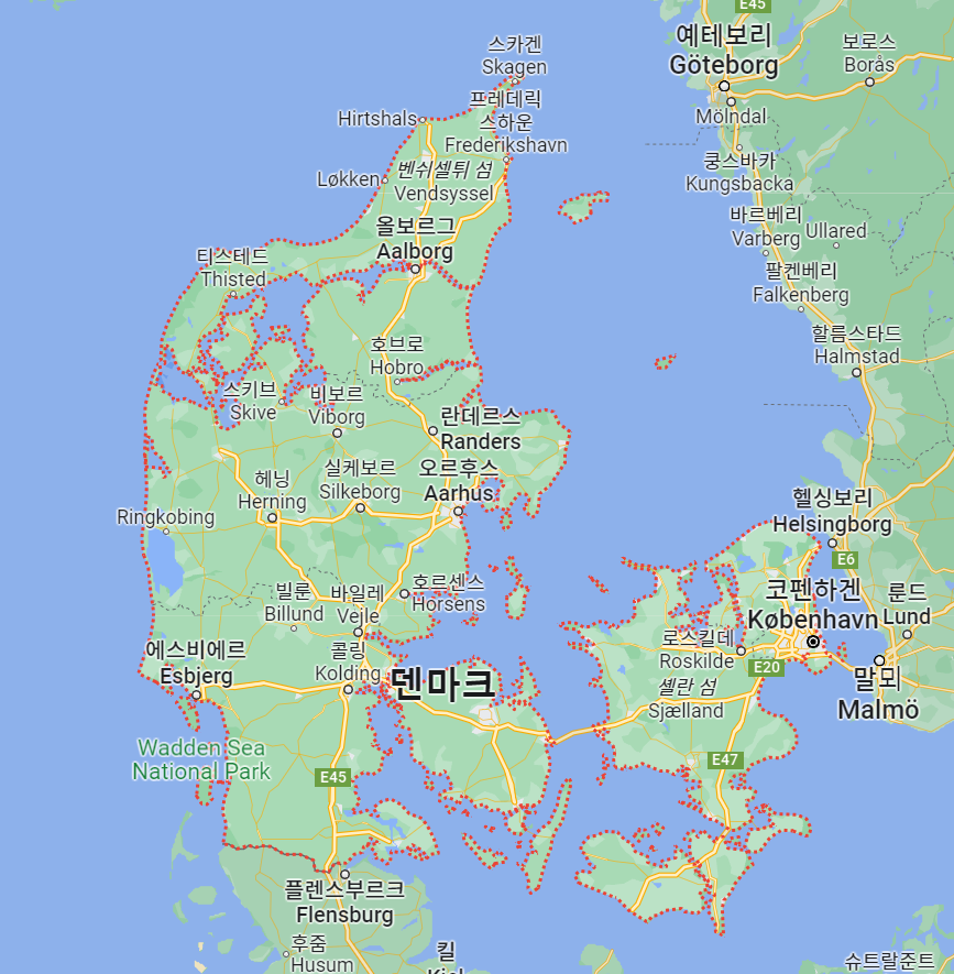 우리가 궁금해하는 미트윌란의 경기장은 바로 왼쪽 반도 정가운데에 있는데 헤닝(Herning)이란 도시에 있습니다. 구글 지도에는 헤닝으로 나오는데 대부분 헤르닝으로 표기하는 것 같습니다. 여기서는 구글 방식의 헤닝으로 표현하겠습니다.