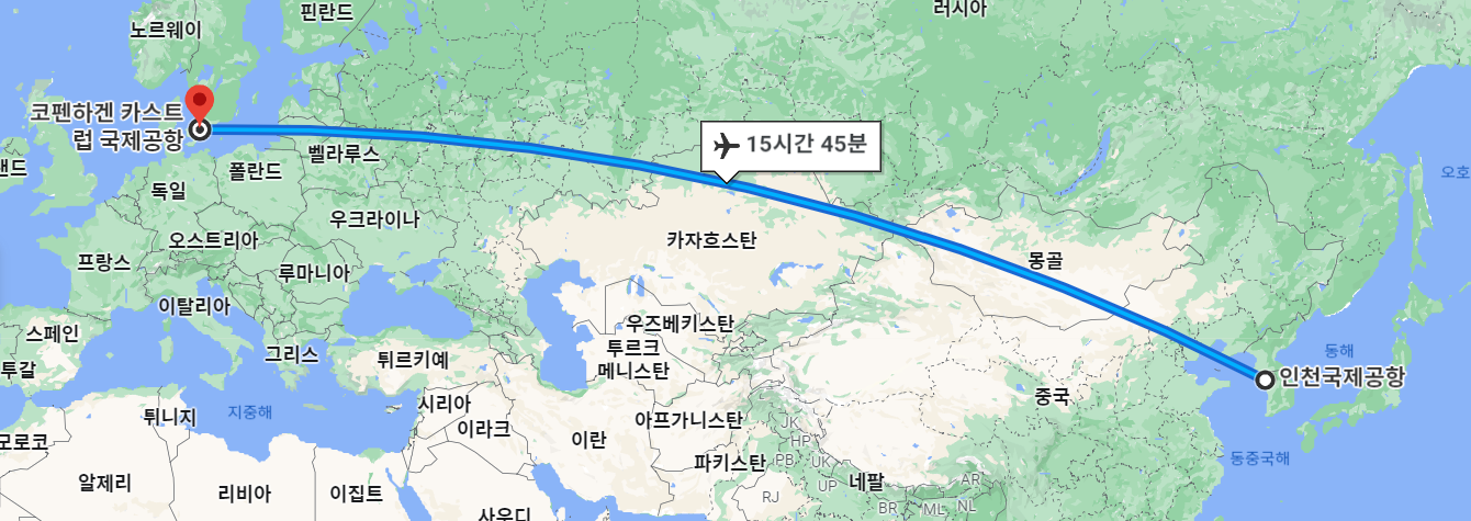 우리나라에서 덴마크까지 비행기로 경유를 한 번 하면 15시간 45분정도 걸려 도착할 수 있다고 합니다. 인천국제공항에서 코펜하겐 카스트럽 국제공항에 도착할 경우 걸리는 시간입니다.