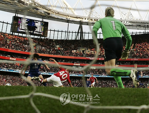안데르송의 스루패스를 받아 호날두가 왼쪽 측면을 빠르게 돌파하며 땅볼 크로스 패스를 연결했고, 문전 우측으로 흘러든 볼은 깁스가 중심을 잃고 넘어진 틈을 타 박지성이 달려들어 알무니아 골키퍼를 넘기는 슬라이딩 슛으로 마무리했다. 박지성은 맨유 입단 후 처음으로 챔피언스리그 무대에서 골맛을 보며 2경기 연속골, 시즌 4호골 득점에 성공했다. 이제 아스널은 결승 진출을 위해 3골이 필요하게 됐다.